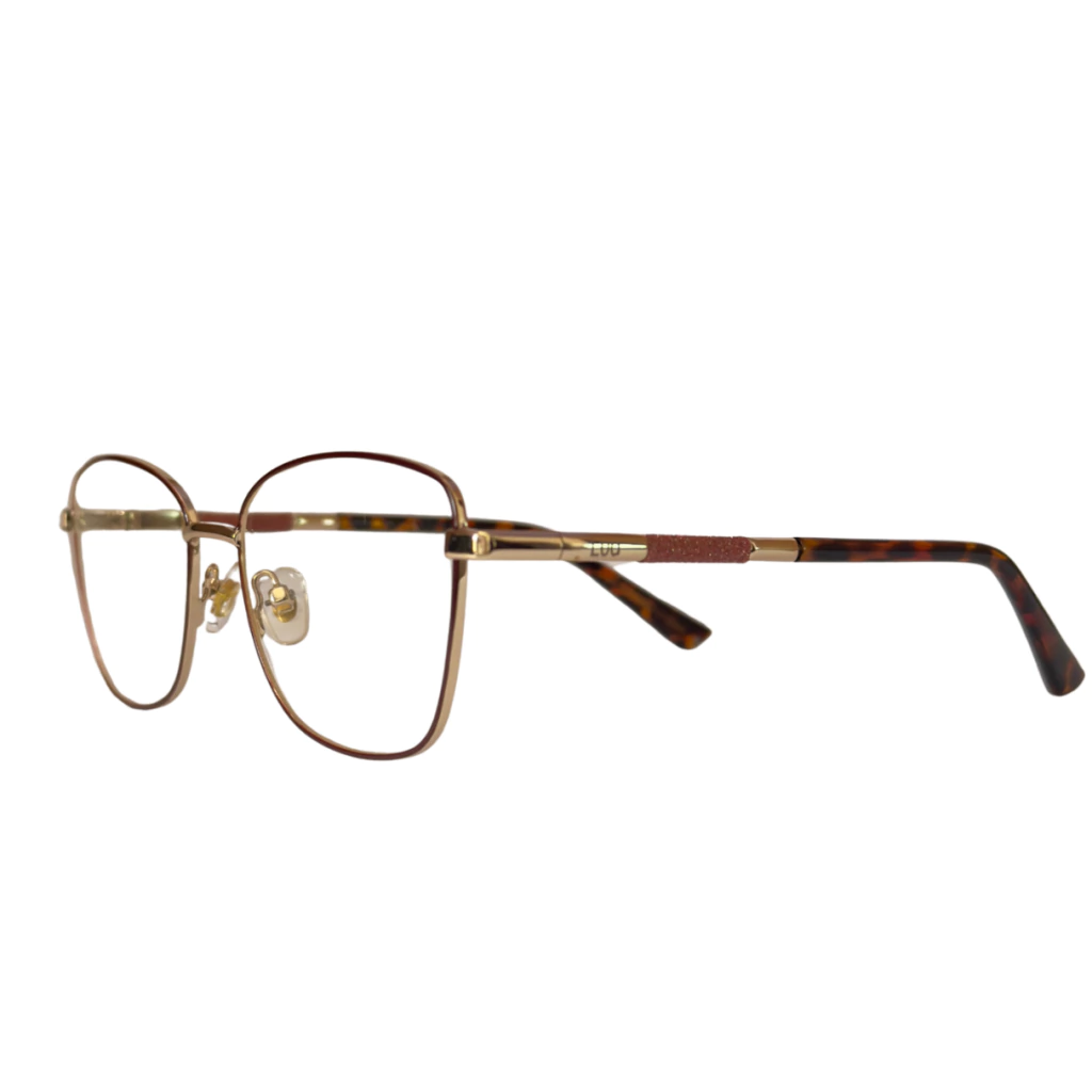 • A armação de grau é confeccionada em metal nobre ultraleve, apresentando um acabamento sofisticado que combina tons de vermelho e dourado, conferindo um toque de elegância incomparável. As hastes recebem um acabamento texturizado e brilhante, ressaltando o cuidado em cada detalhe.